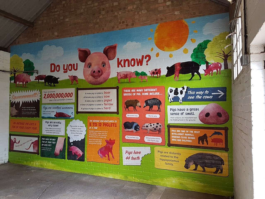 Whilst visiting the farm, we were also asked if we could enhance and increase the interactivity of the fantastic pig barn with a unique mural full of fun facts and stats about these wonderful animals. In just two days our ham-azing illustrator and designer Andrew had researched, visualised and drawn a beautiful 5m x 3m mural.