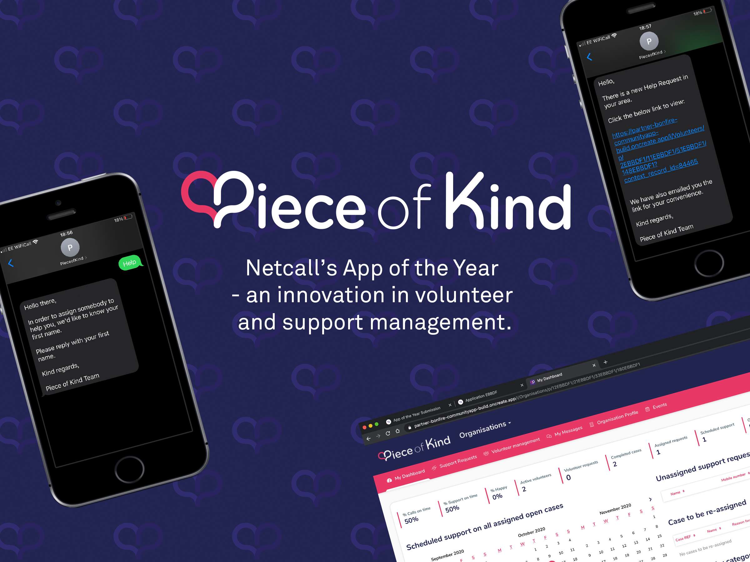 PieceOfKind – Is an award winning innovative new system using simple SMS and cutting-edge technology to dynamically link a support request to a volunteer, onboard and manage volunteers, and provide vital validation of all volunteer support services.