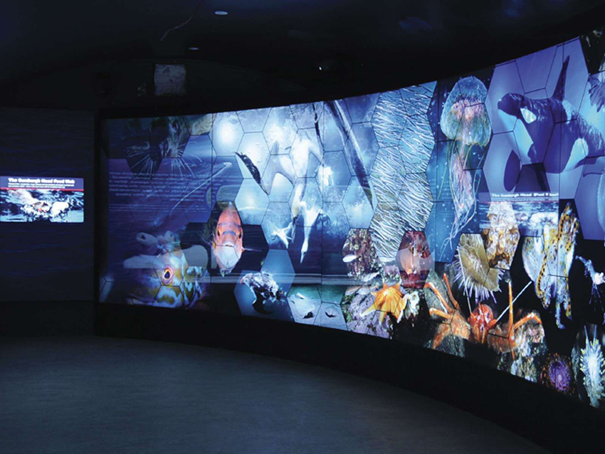 The singular visionary approach was to create a ‘journey’ across two floors of this Marine Life Centre and capture the imagination of all ages. Everywhere sights, sounds and interactive media worked in harmony merging two- and three-dimensional content. This included an immersive underwater ‘cocoon’ that submerges you in to the diverse marine life surrounding Sumburgh Head, from zooplankton to minke whales.